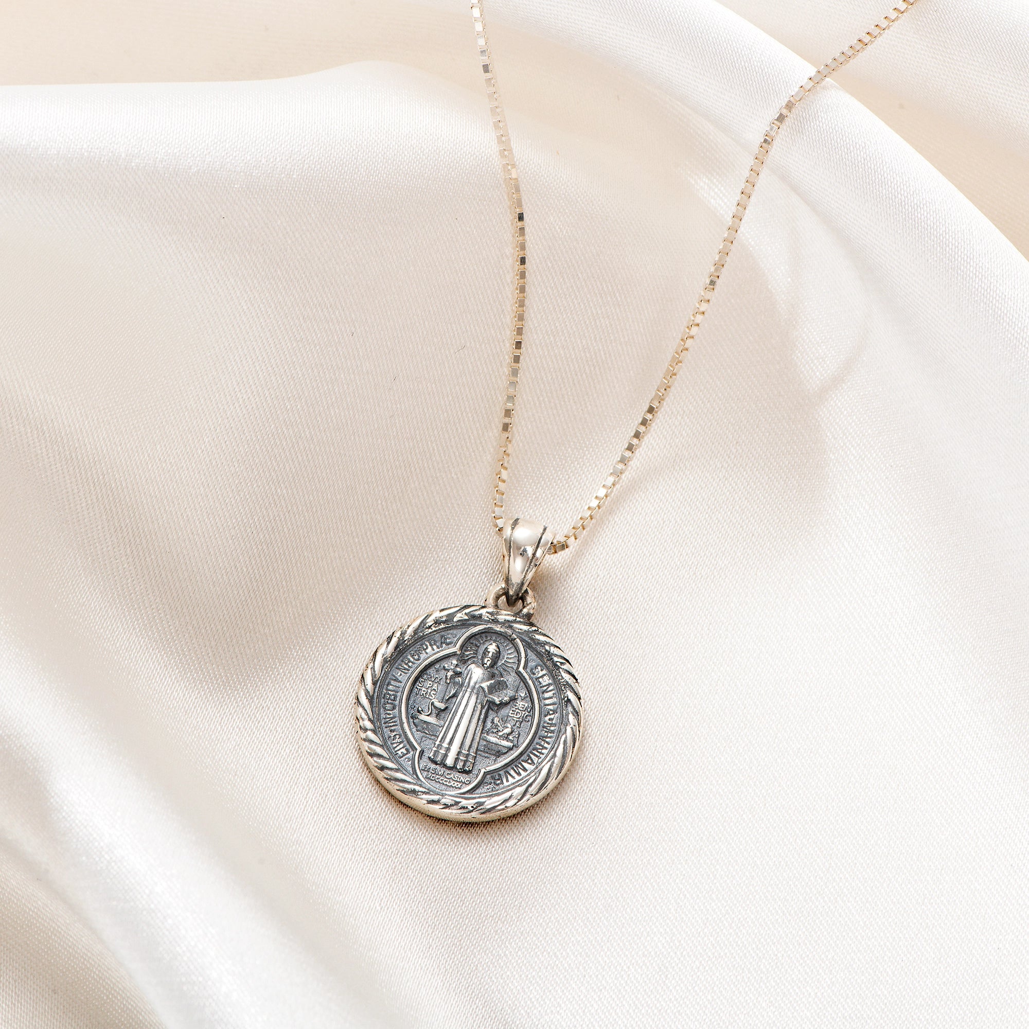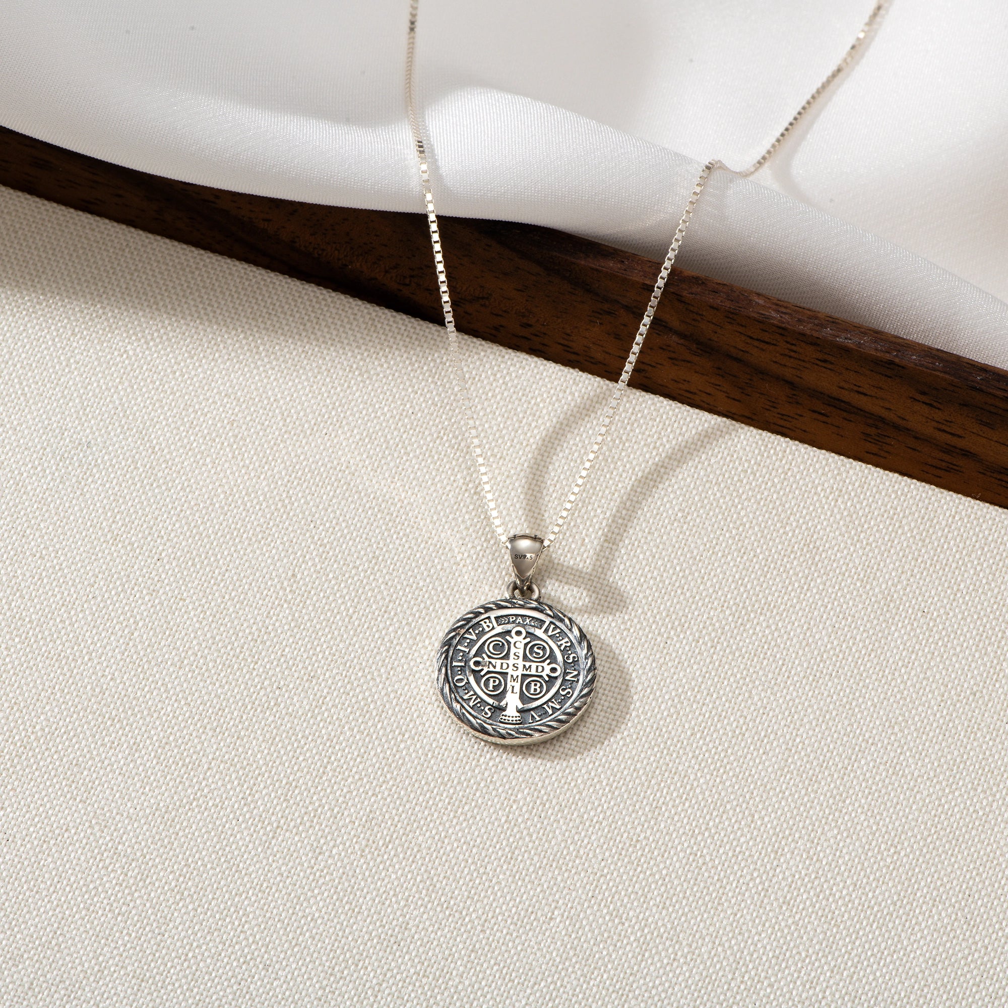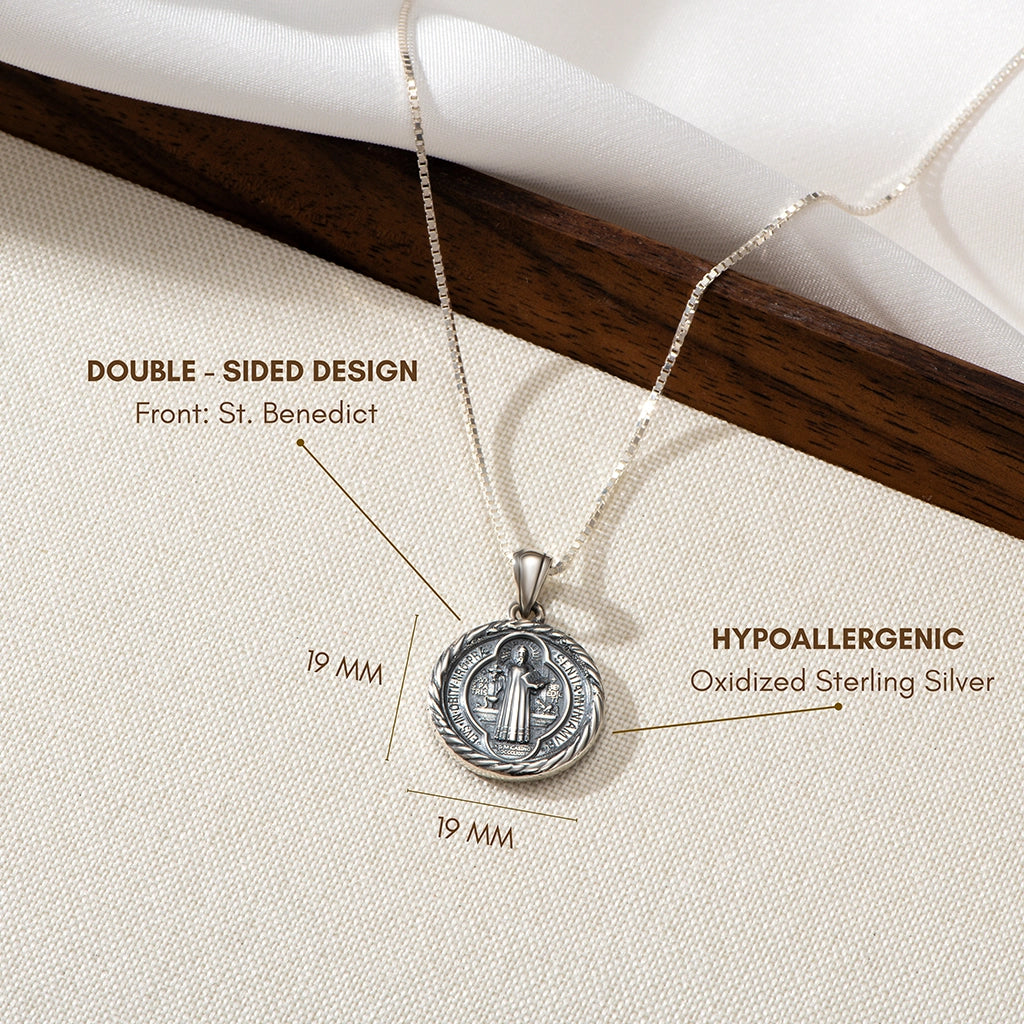 This beautifully detailed pendant features the revered image of St. Benedict of Nursia, the father of Western monasticism and a powerful intercessor against evil. Holding the Rule of St. Benedict in one hand and the cross in the other, the saint is framed with the Latin plea:
