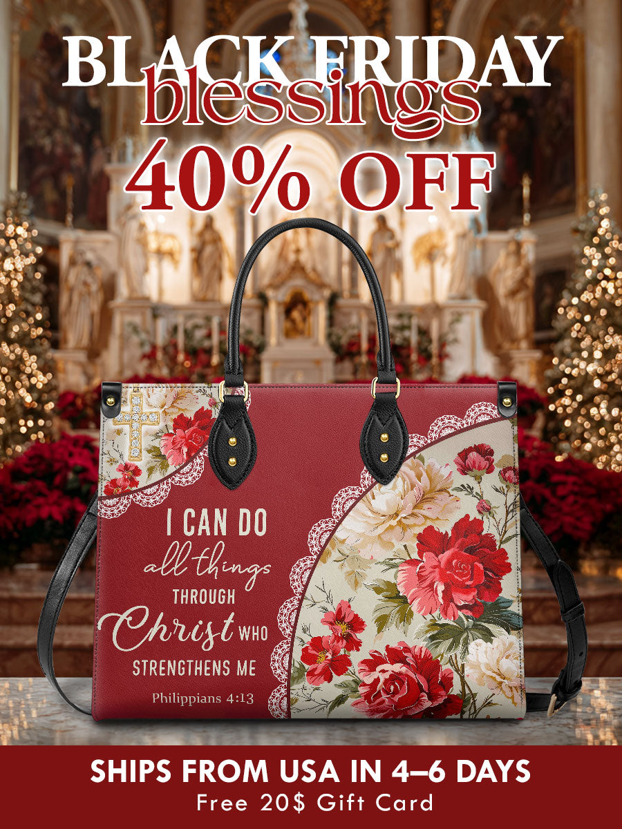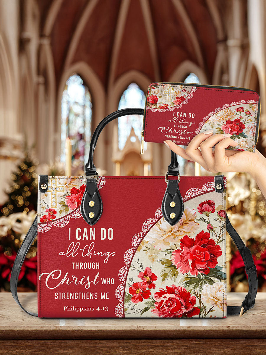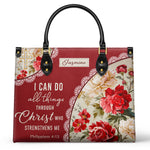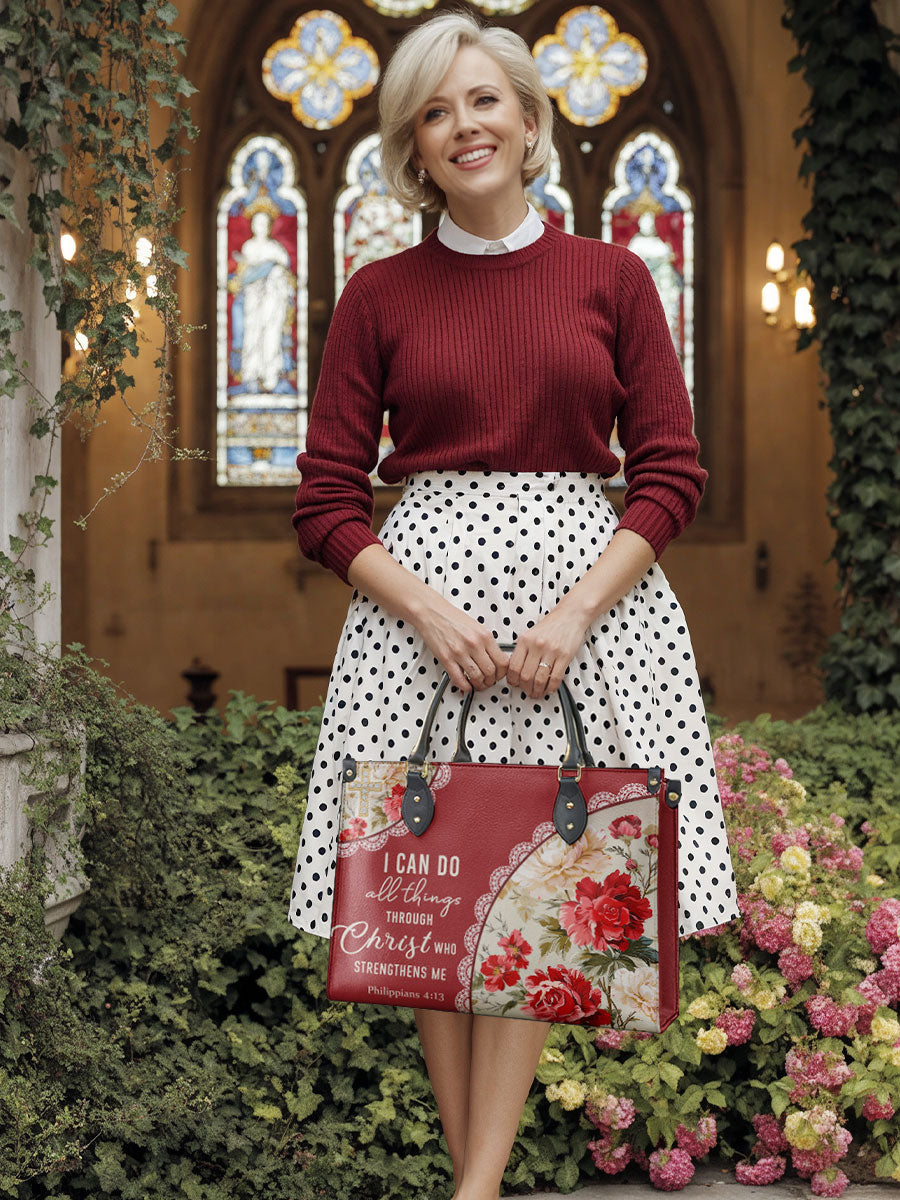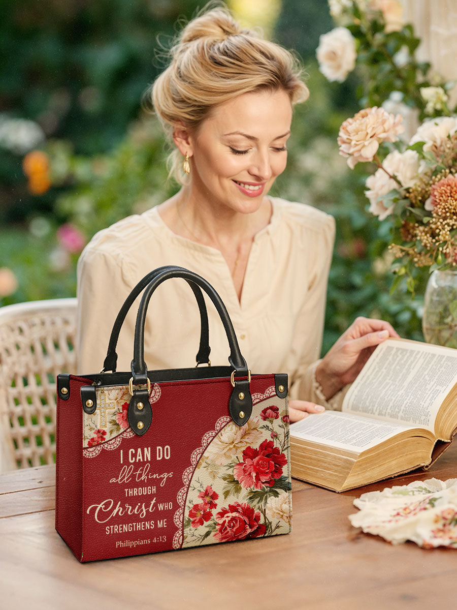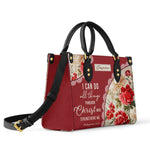 This beautifully designed leather bag features the empowering Bible verse “I can do all things through Christ who strengthens me” from Philippians 4:13. Set against a rich crimson backdrop, the verse is framed by delicate lace accents and vibrant floral motifs, including bold red roses that symbolize love, strength, and faith. A subtle cross and personalized name detail add a meaningful and personal touch to this elegant and spiritually uplifting design.