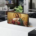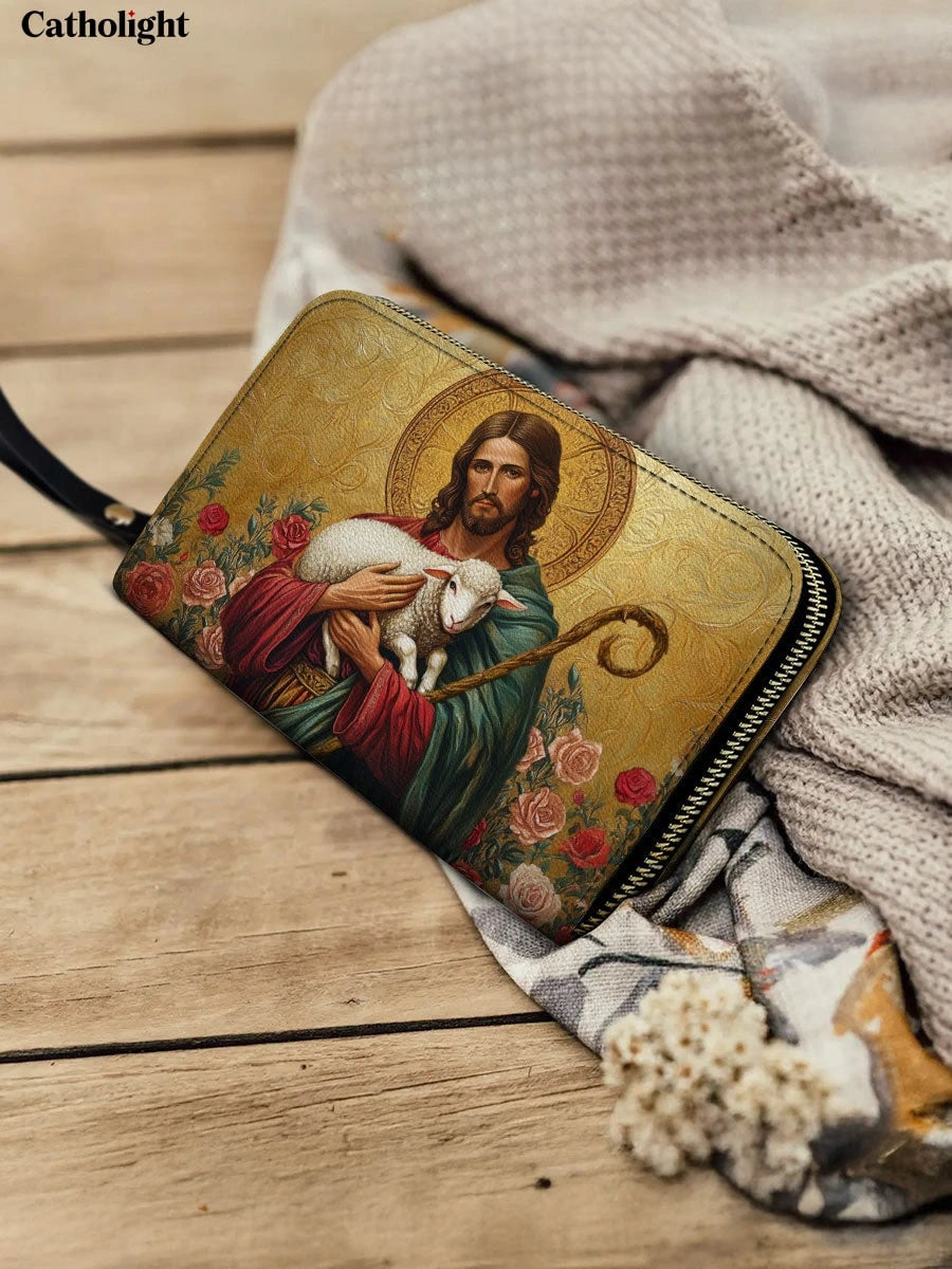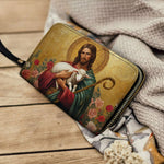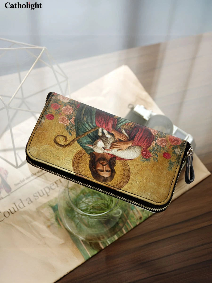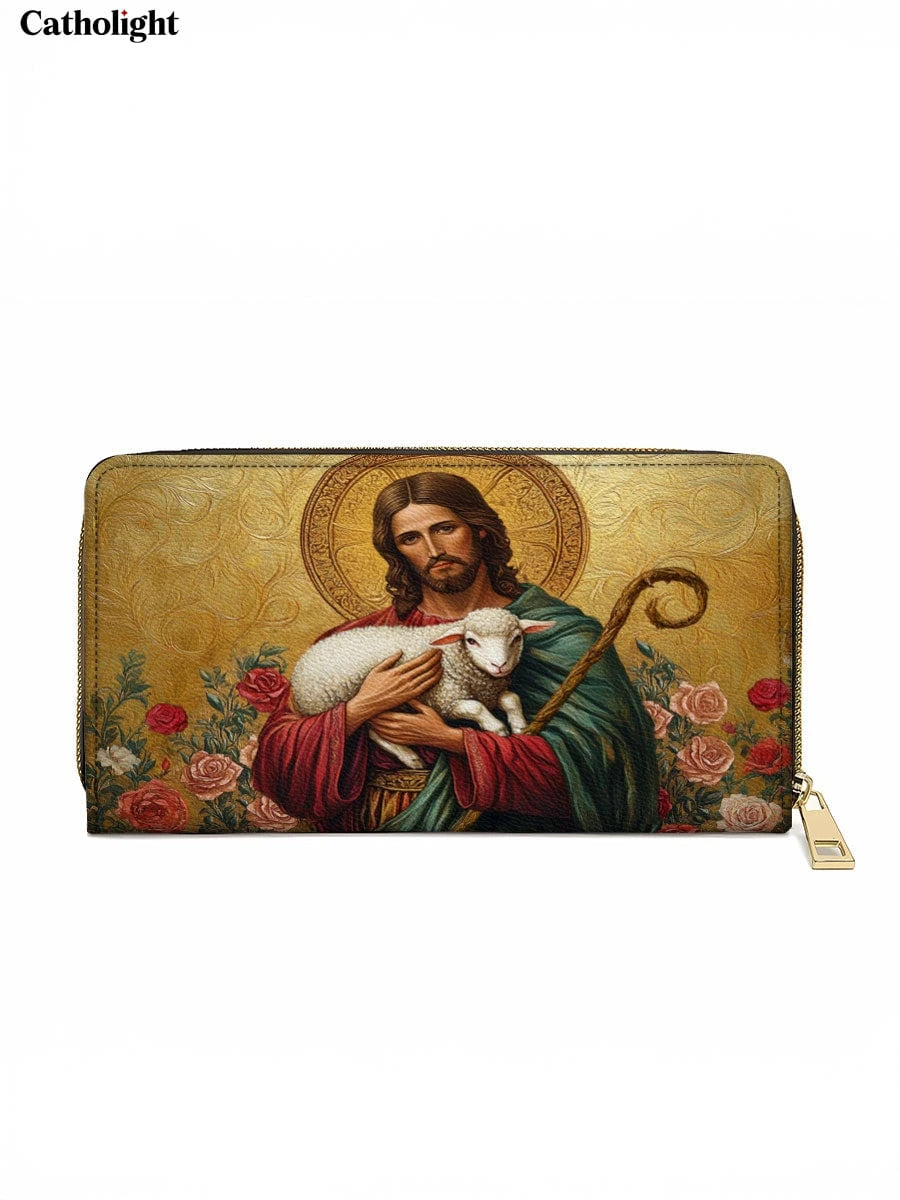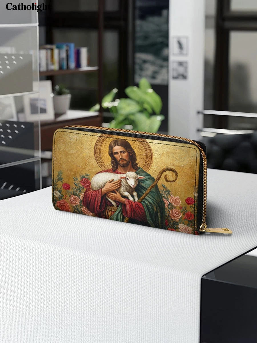 This beautifully designed wallet portrays Jesus as the Good Shepherd, holding a lamb with tenderness and care. Surrounded by blooming roses and radiant golden accents, the artwork symbolizes Christ's infinite love, compassion, and protection for His followers. The serene expression of the Shepherd and the gentle presence of the lamb create a feeling of peace and spiritual connection.