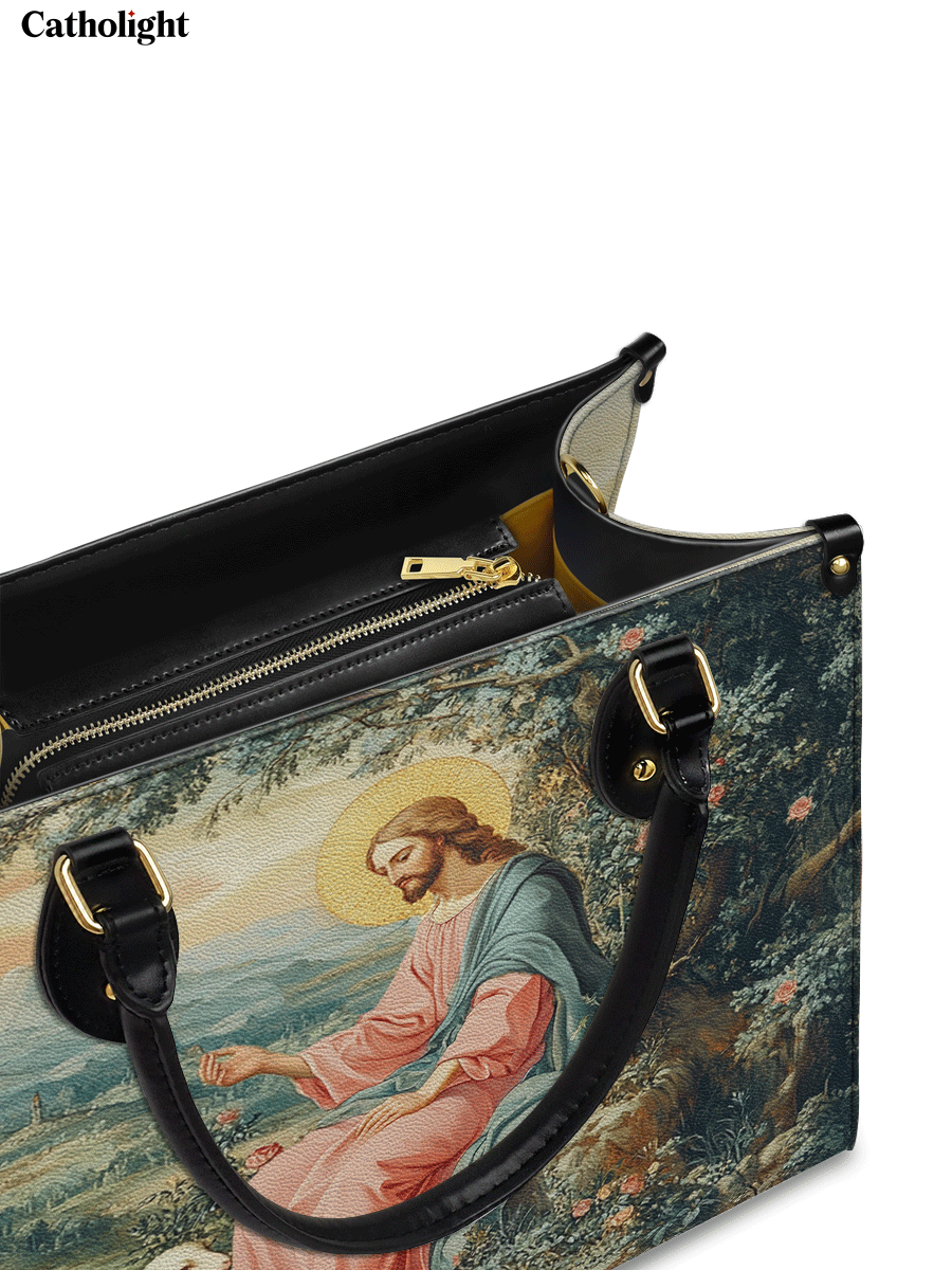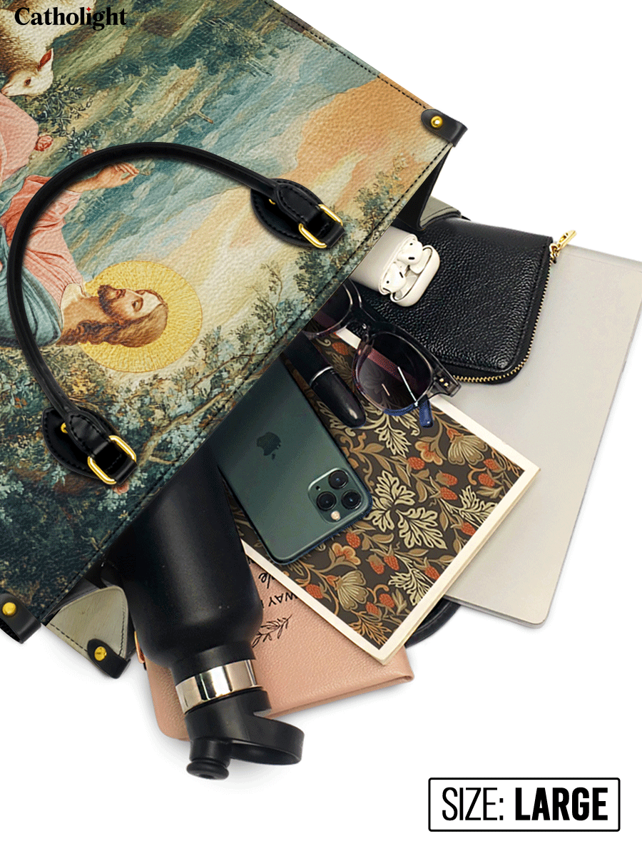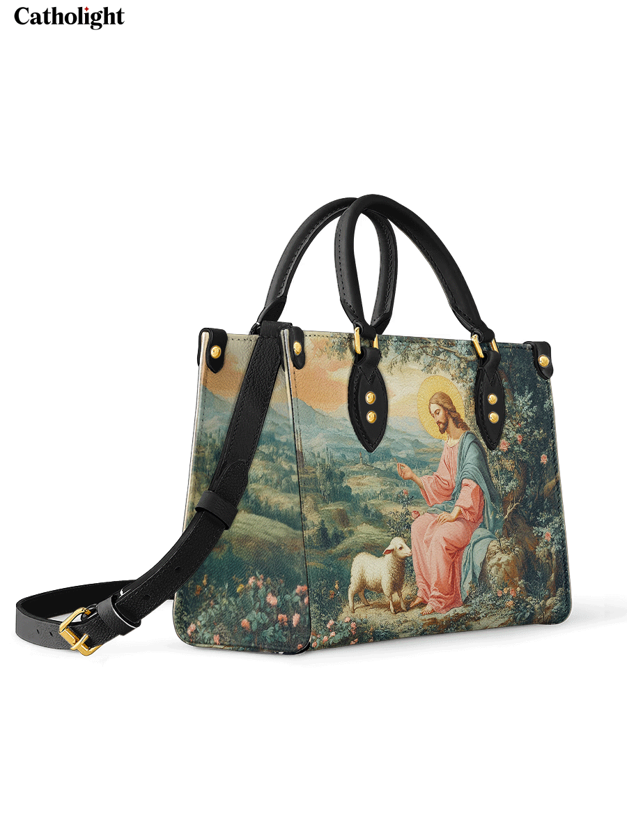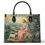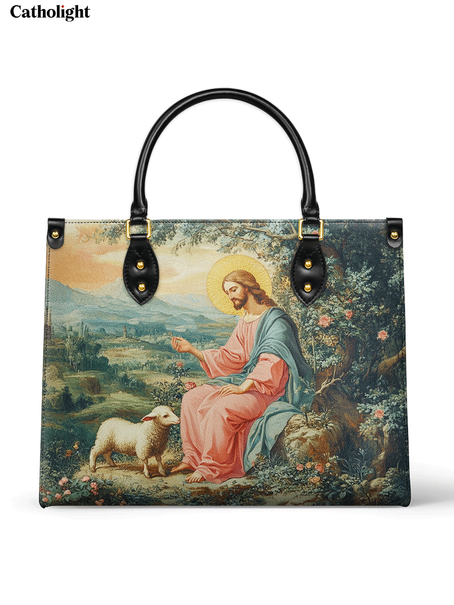 This stunning leather bag beautifully illustrates Jesus Christ as the Good Shepherd, a timeless emblem of His boundless compassion and unwavering guidance. Seated gracefully amidst a serene pastoral landscape, Jesus is depicted gently tending to a lamb, symbolizing His role as protector and caretaker of His flock. The lamb, an emblem of purity and innocence, represents humanity's trust in His divine care.