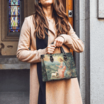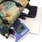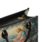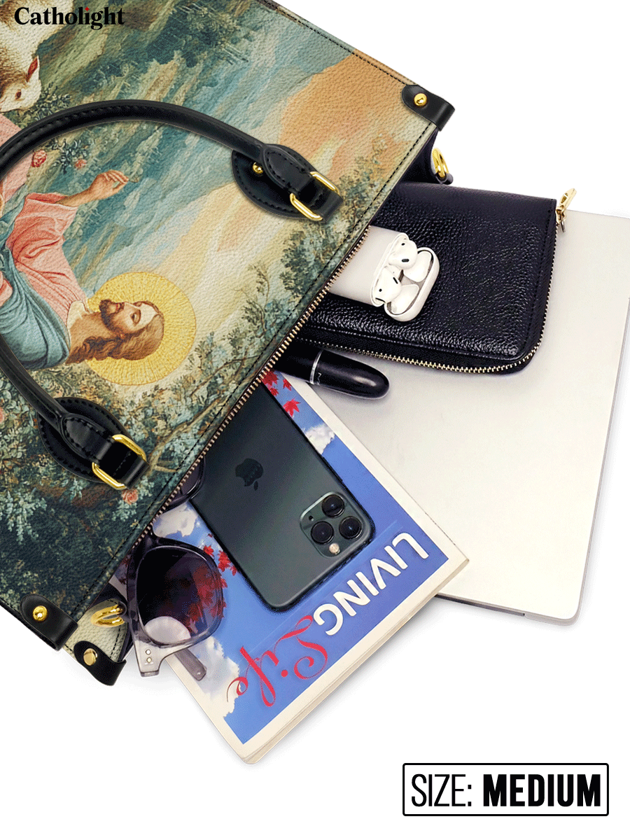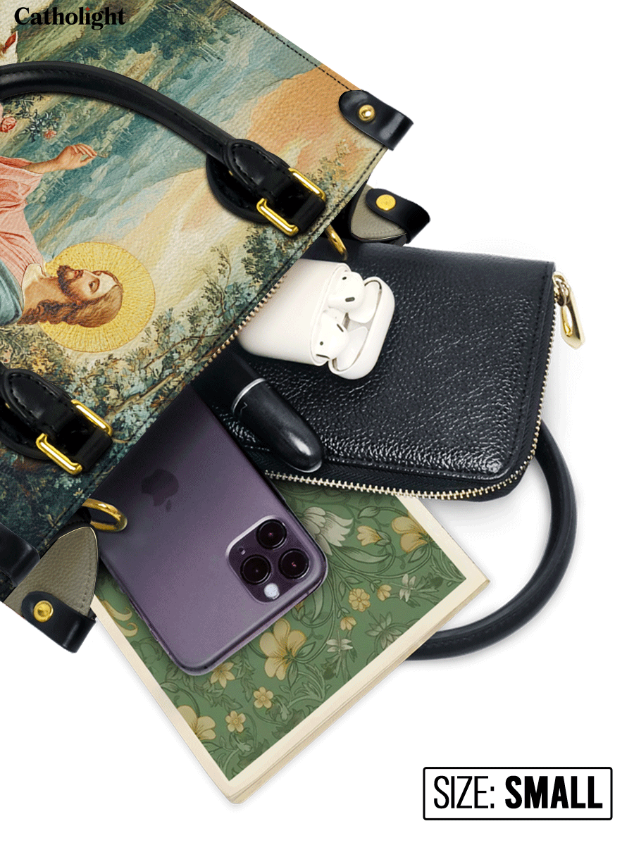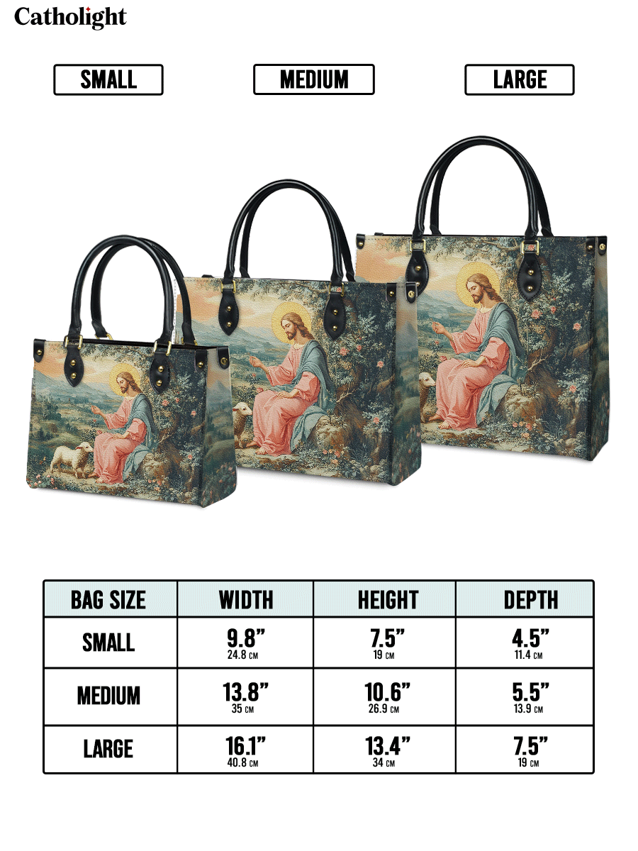 This stunning leather bag beautifully illustrates Jesus Christ as the Good Shepherd, a timeless emblem of His boundless compassion and unwavering guidance. Seated gracefully amidst a serene pastoral landscape, Jesus is depicted gently tending to a lamb, symbolizing His role as protector and caretaker of His flock. The lamb, an emblem of purity and innocence, represents humanity's trust in His divine care.