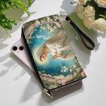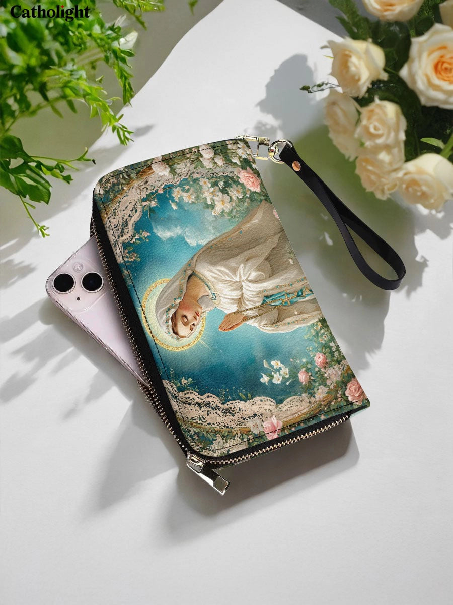 This beautifully designed wallet honors Our Lady of Lourdes, portraying her in prayer with a radiant halo and surrounded by delicate roses. The intricate lace-like details and soft blue tones symbolize her purity and divine grace, while the serene design inspires peace and devotion. This wallet reflects her role as a source of healing and hope, making it a meaningful expression of faith.