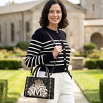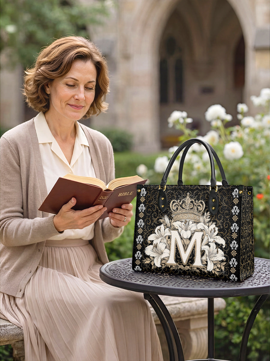 The "Divine Monogram Leather Bag" is a striking tribute to the Blessed Virgin Mary, featuring a majestic "M" monogram encircled by radiant white lilies and crowned with an ornate golden crown. The rich black background and intricate decorative patterns emphasize the regal beauty and sacred symbolism of the design, representing Mary's purity, grace, and her role as the Queen of Heaven.