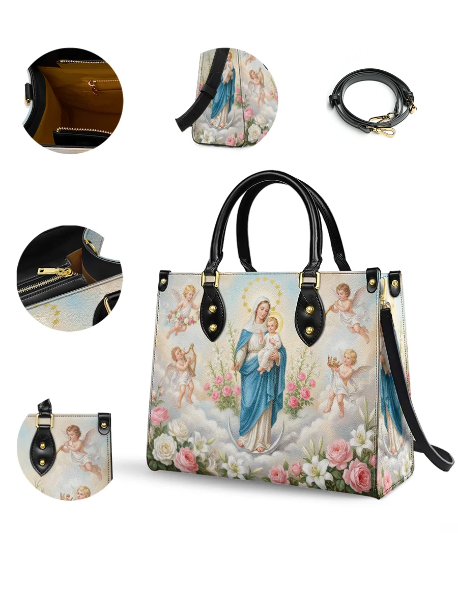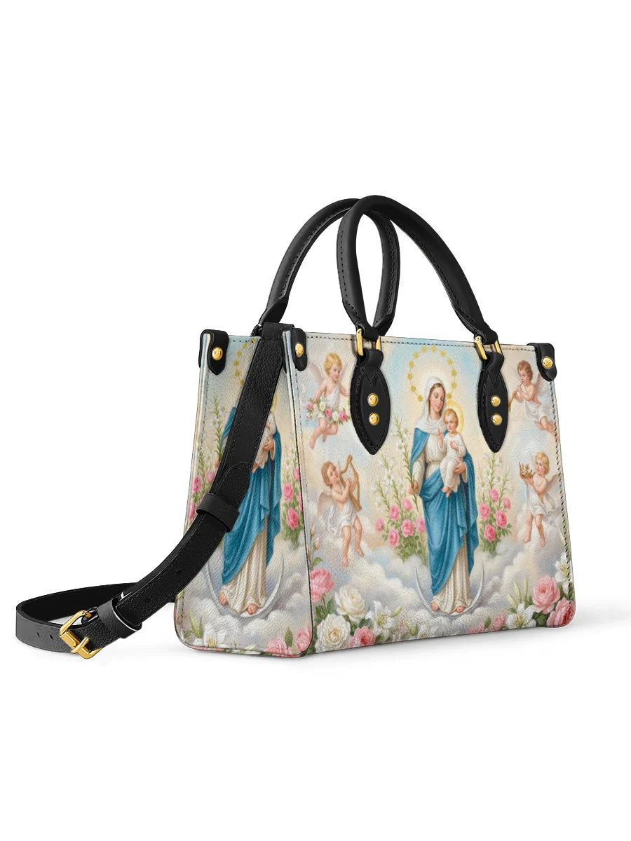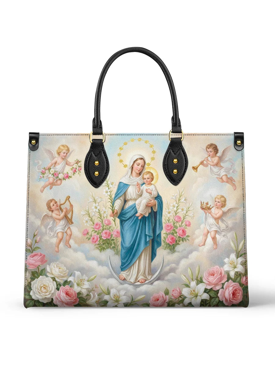 This exquisite bag features a radiant and joyful depiction of the Virgin Mary crowned as Queen of Heaven, standing gracefully amid soft clouds and blooming flowers. Mary gently holds the Child Jesus in her arms, her posture calm and welcoming, while her serene expression reflects maternal love and divine grace. Surrounding her are cherubic angels in motion - some carrying flowers, others playing sacred instruments, creating a heavenly scene filled with life and celebration.