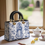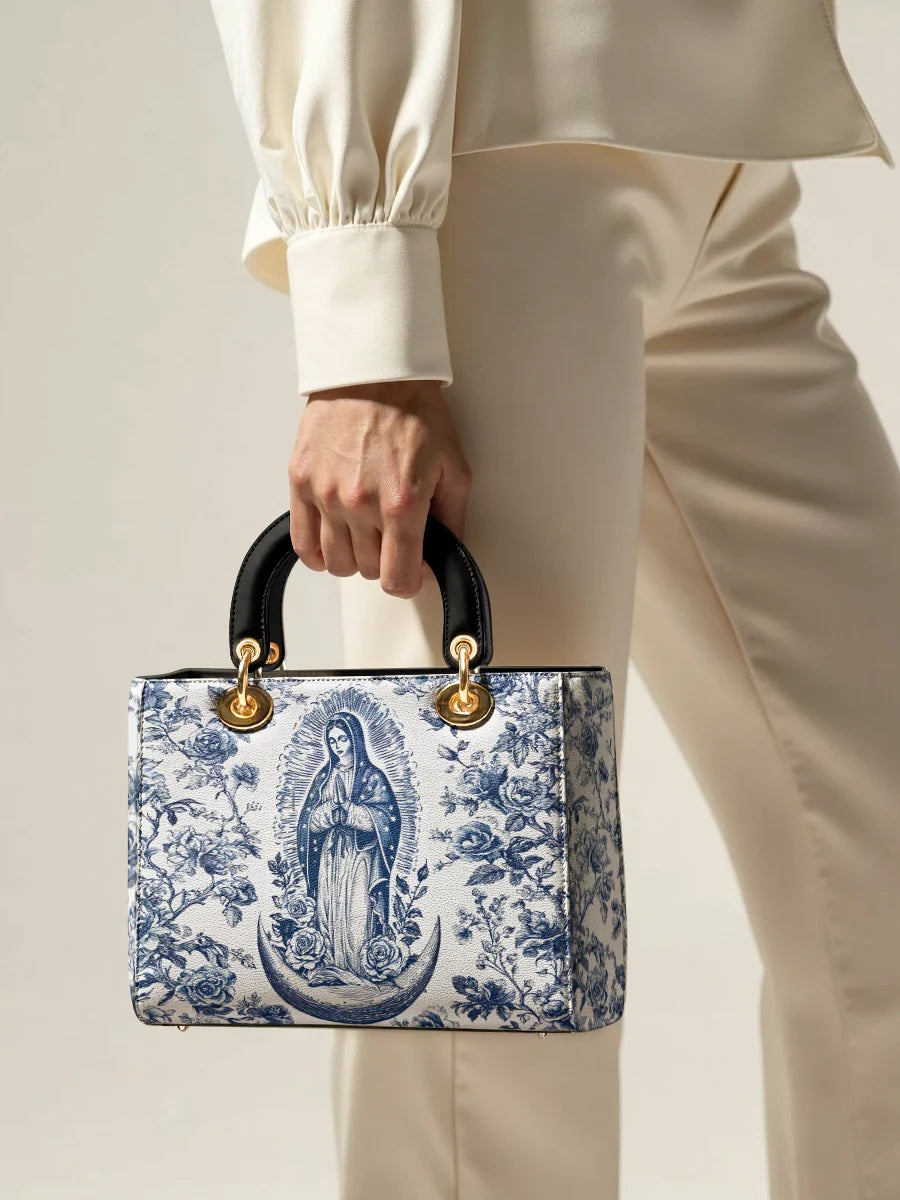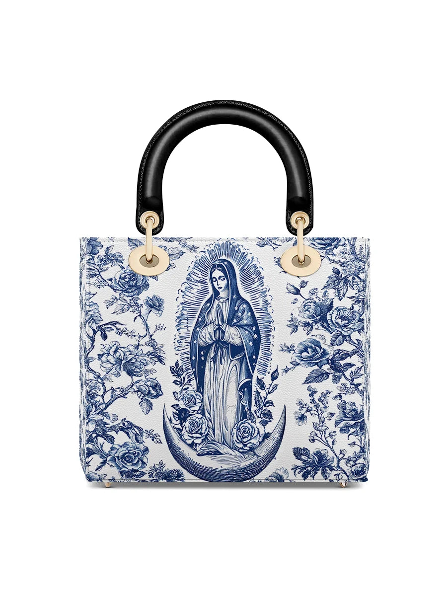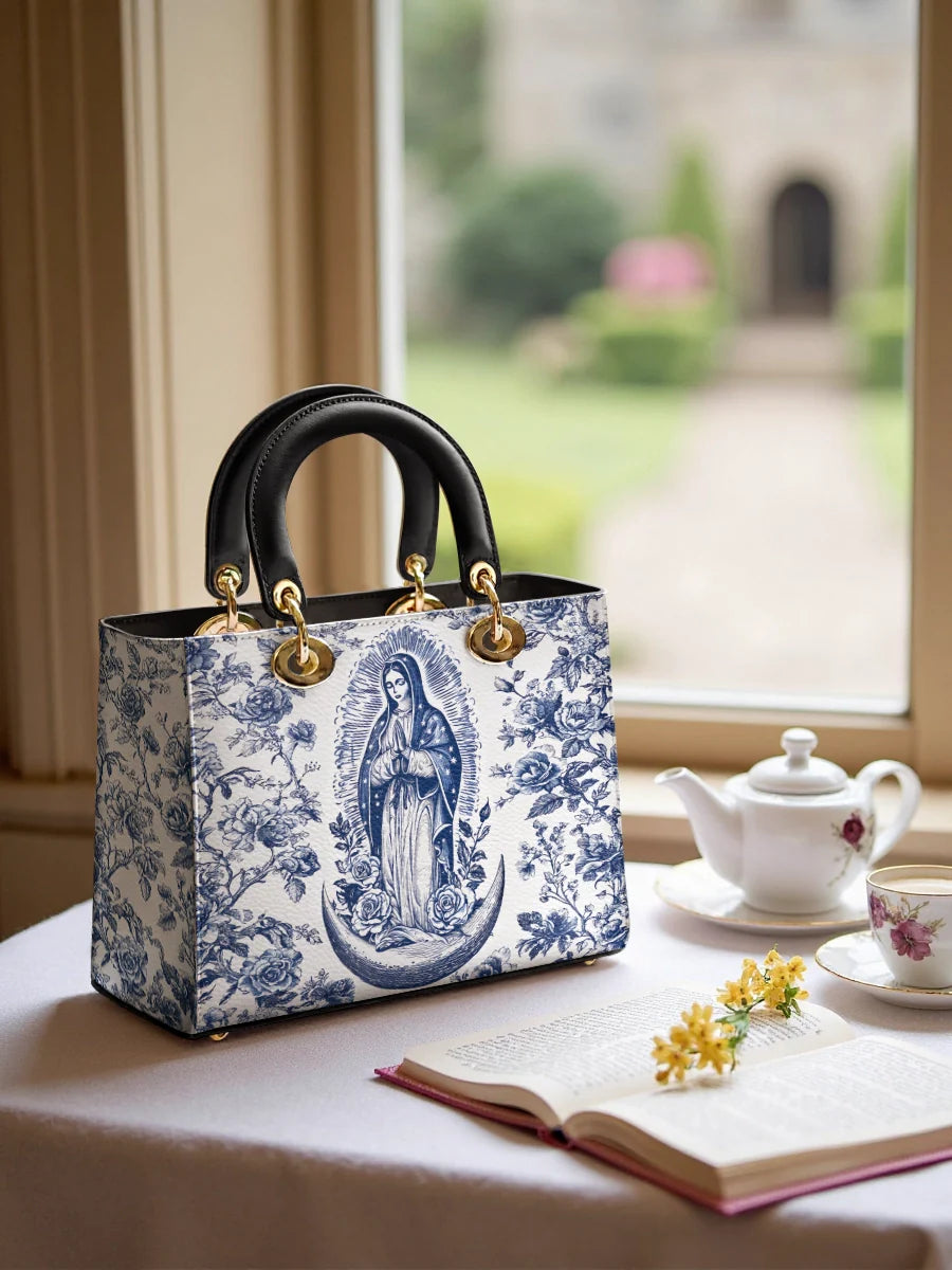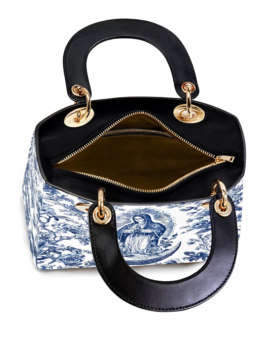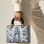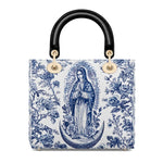 The Sacred Serenity Virgin Mary Leather Bag is a beautifully designed handbag that combines faith, elegance, and artistry. Made from premium leather, this tote features a classic blue-and-white toile pattern adorned with a graceful depiction of the Virgin Mary, symbolizing peace and devotion. The structured silhouette, accented with gold-tone hardware and black leather handles, adds a touch of sophistication. Designed for both style and functionality, this bag is perfect for those who want to carry their faith with them in a refined and fashionable way.
