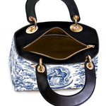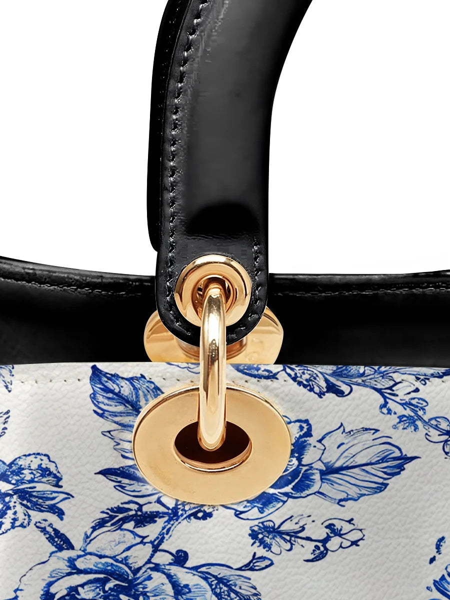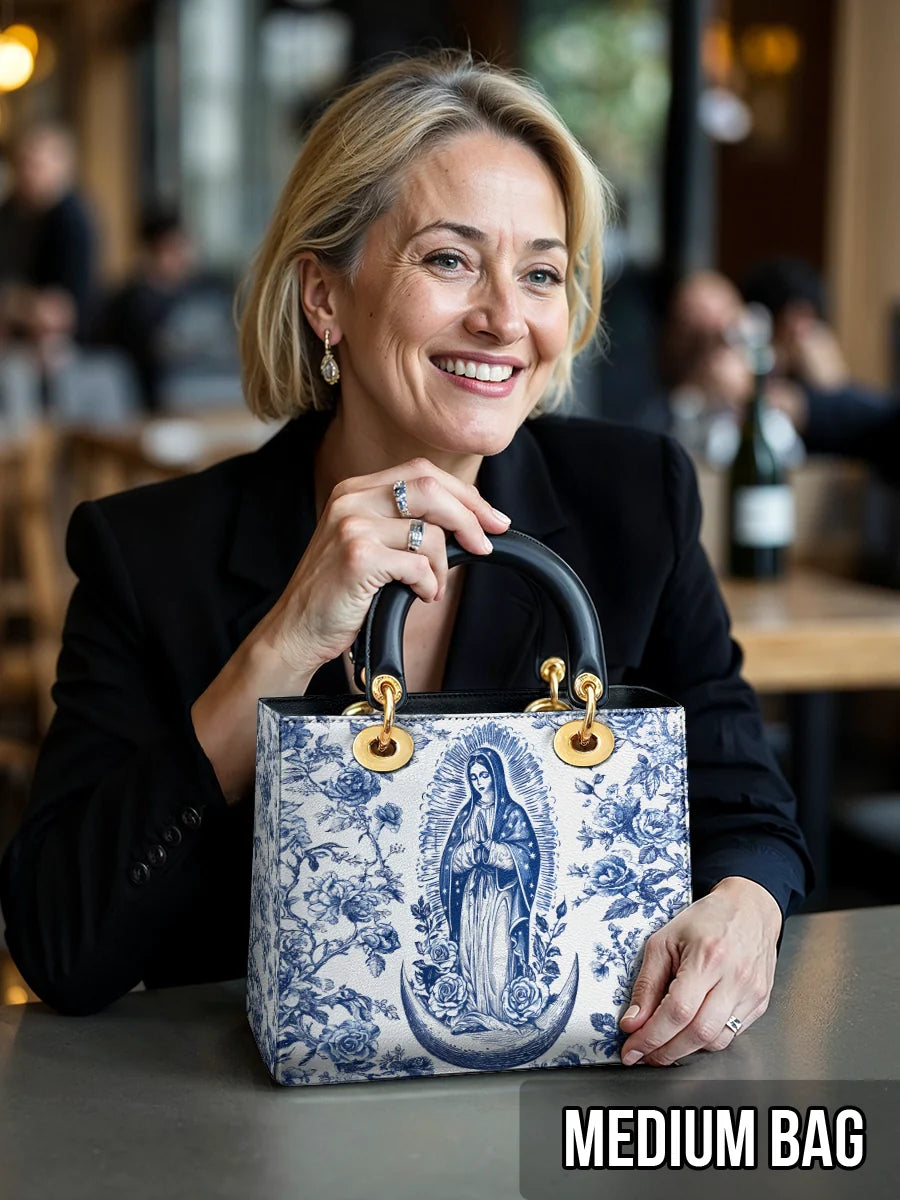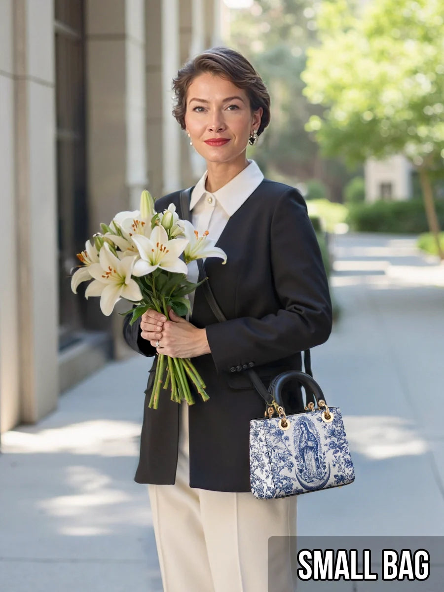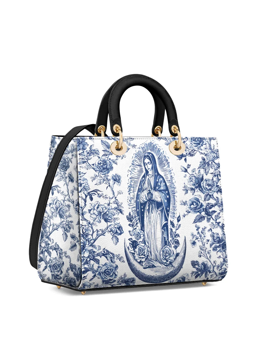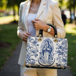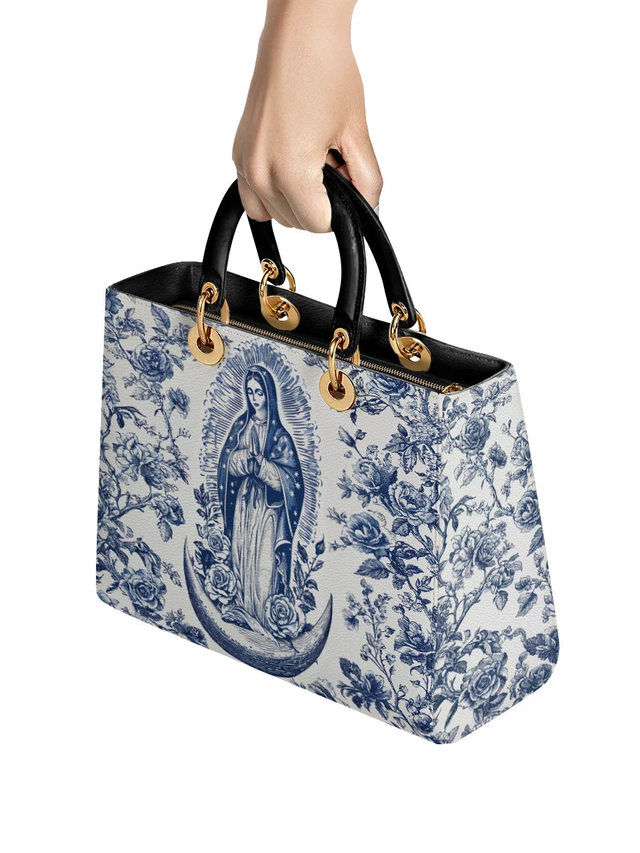 The Sacred Serenity Virgin Mary Leather Bag is a beautifully designed handbag that combines faith, elegance, and artistry. Made from premium leather, this tote features a classic blue-and-white toile pattern adorned with a graceful depiction of the Virgin Mary, symbolizing peace and devotion. The structured silhouette, accented with gold-tone hardware and black leather handles, adds a touch of sophistication. Designed for both style and functionality, this bag is perfect for those who want to carry their faith with them in a refined and fashionable way.