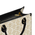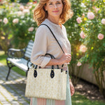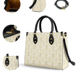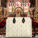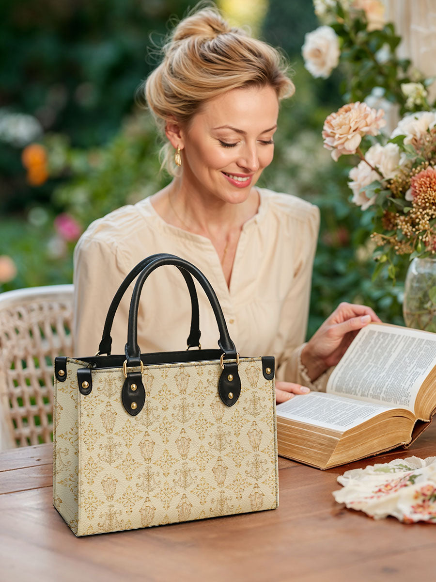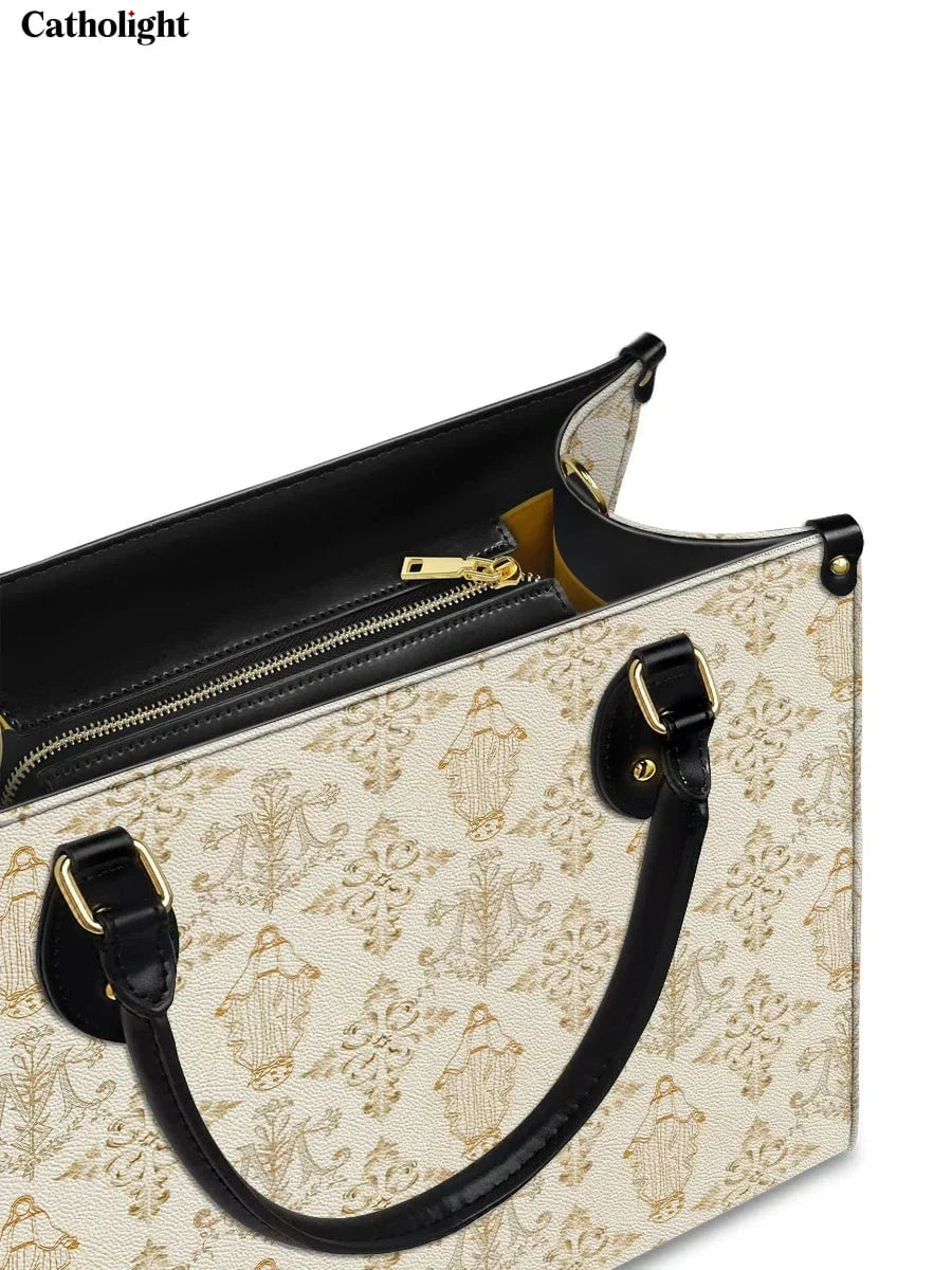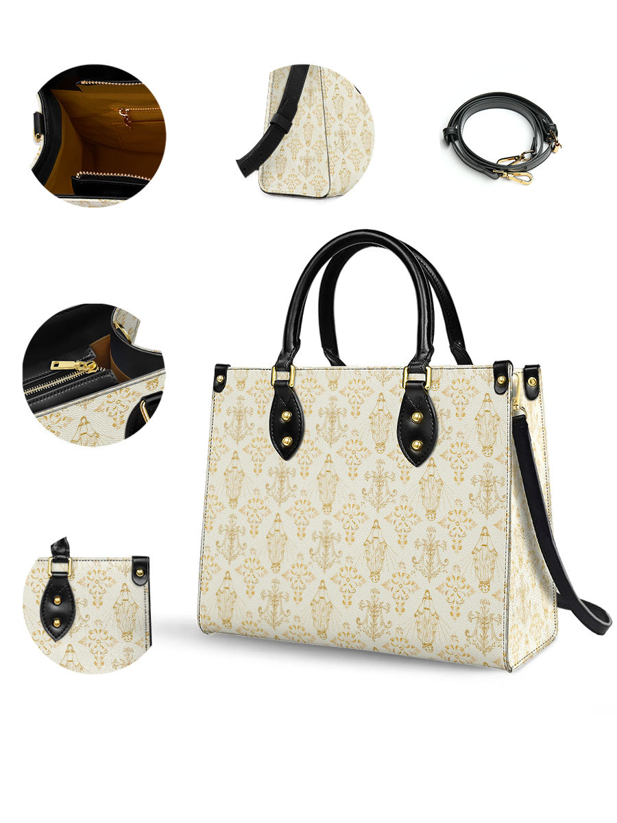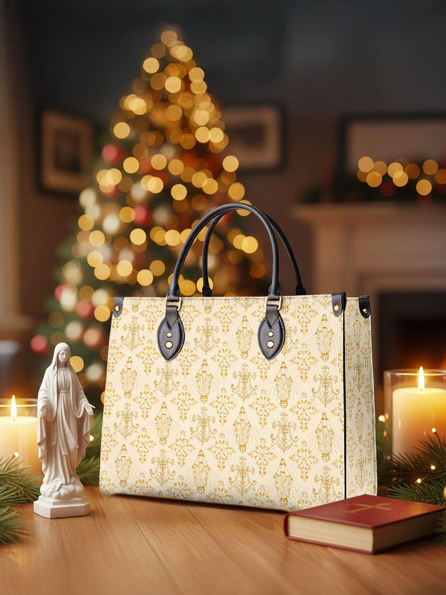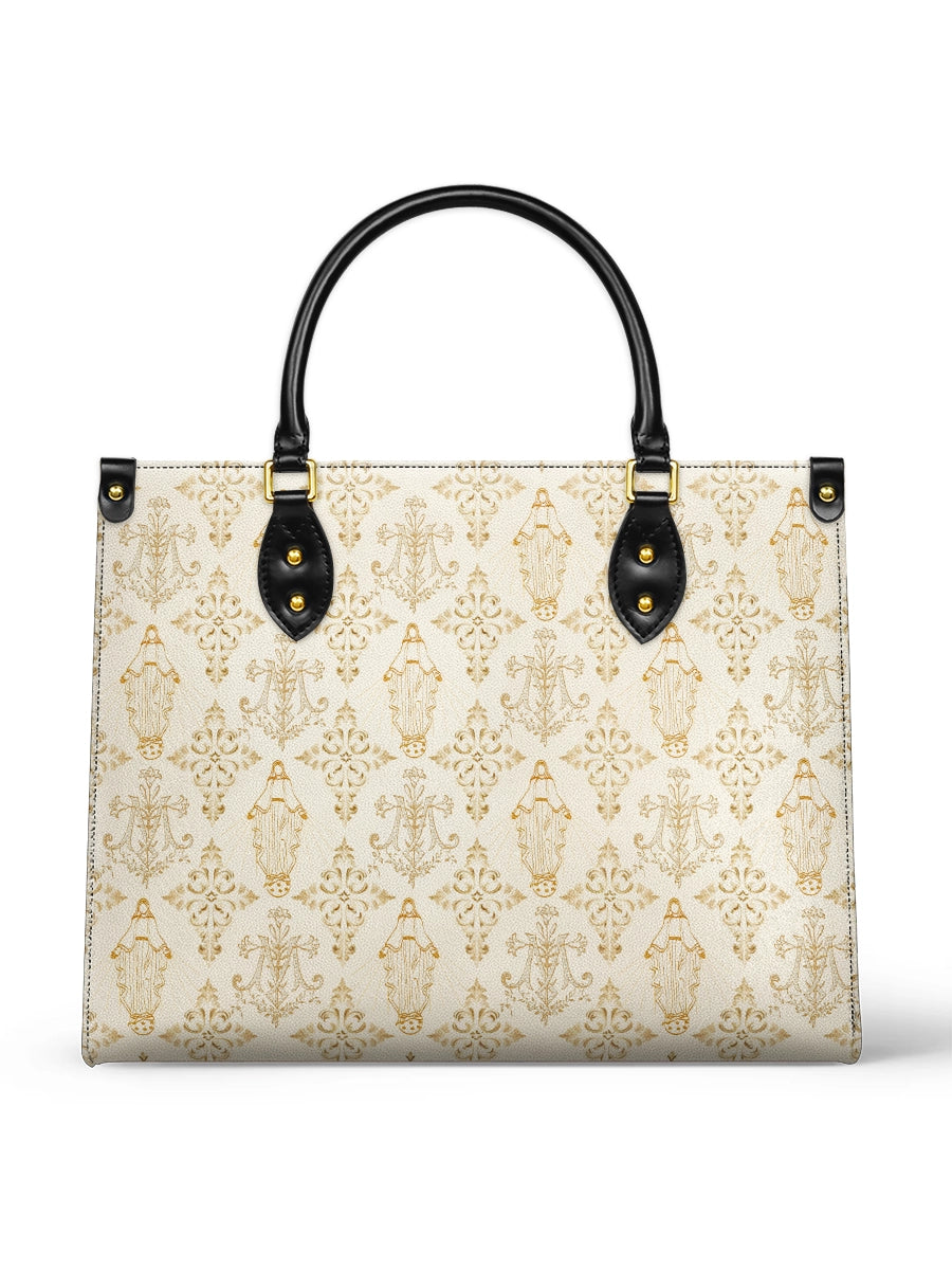 The leather bag is a stunning celebration of faith and devotion, featuring an intricate repeating design of the Blessed Virgin Mary intertwined with elegant floral and ornamental details. The soft, golden accents on the neutral background create a timeless and sophisticated look, symbolizing purity, grace, and divine serenity.
