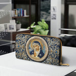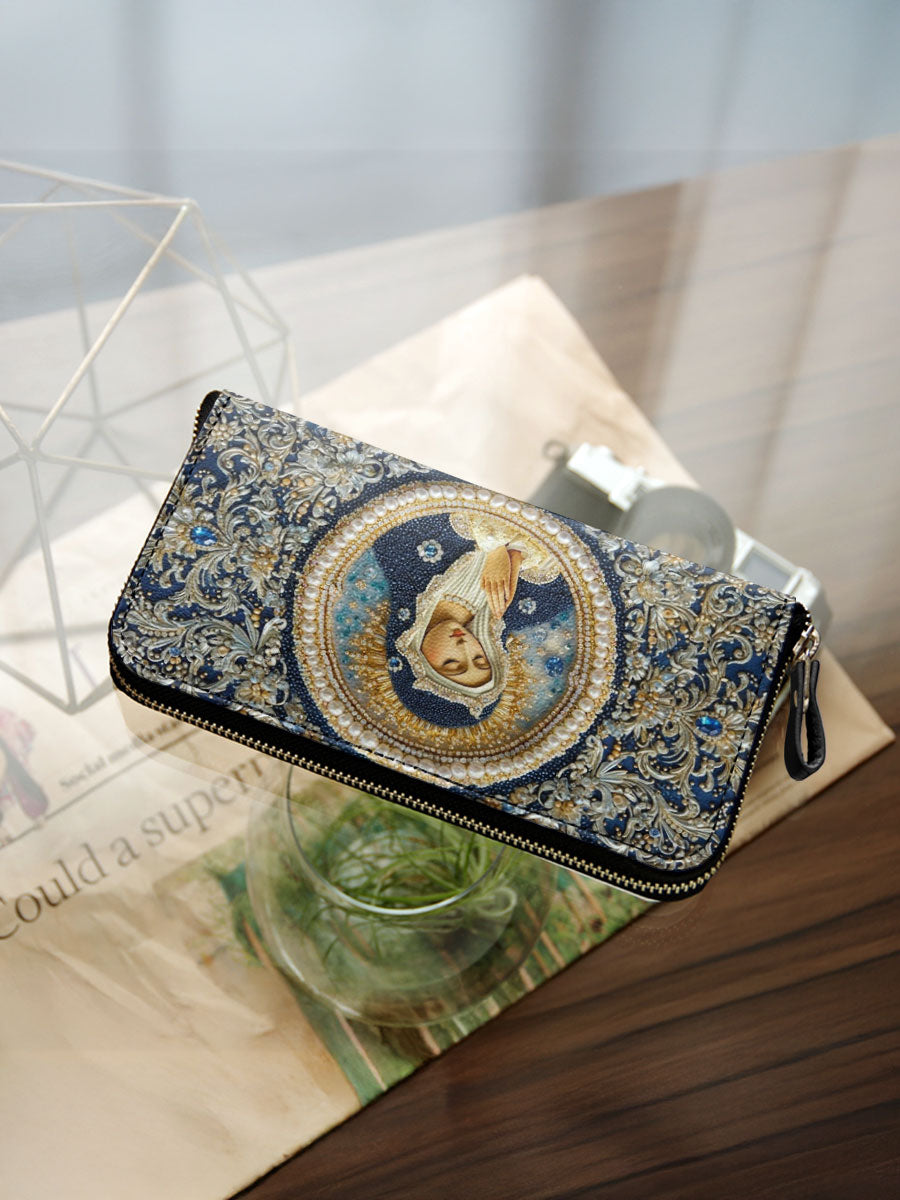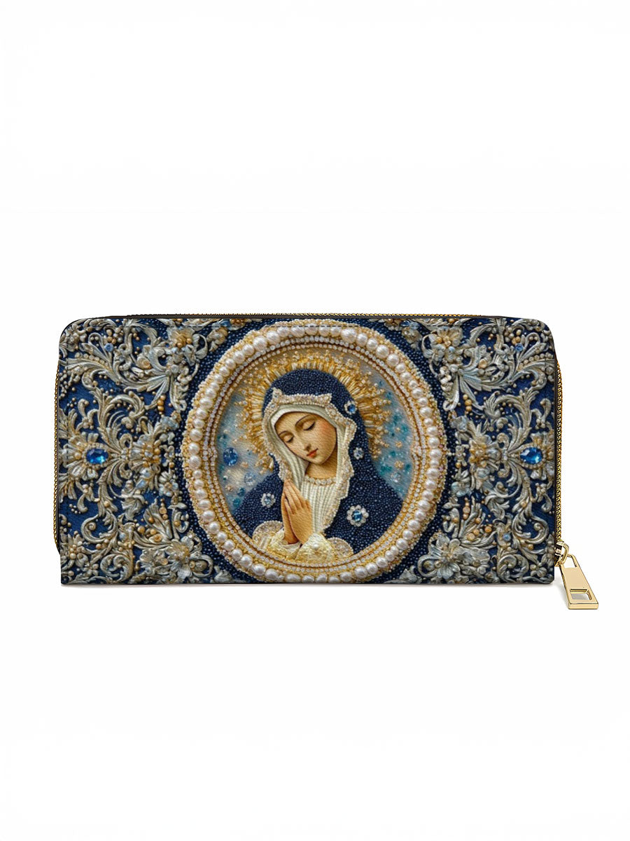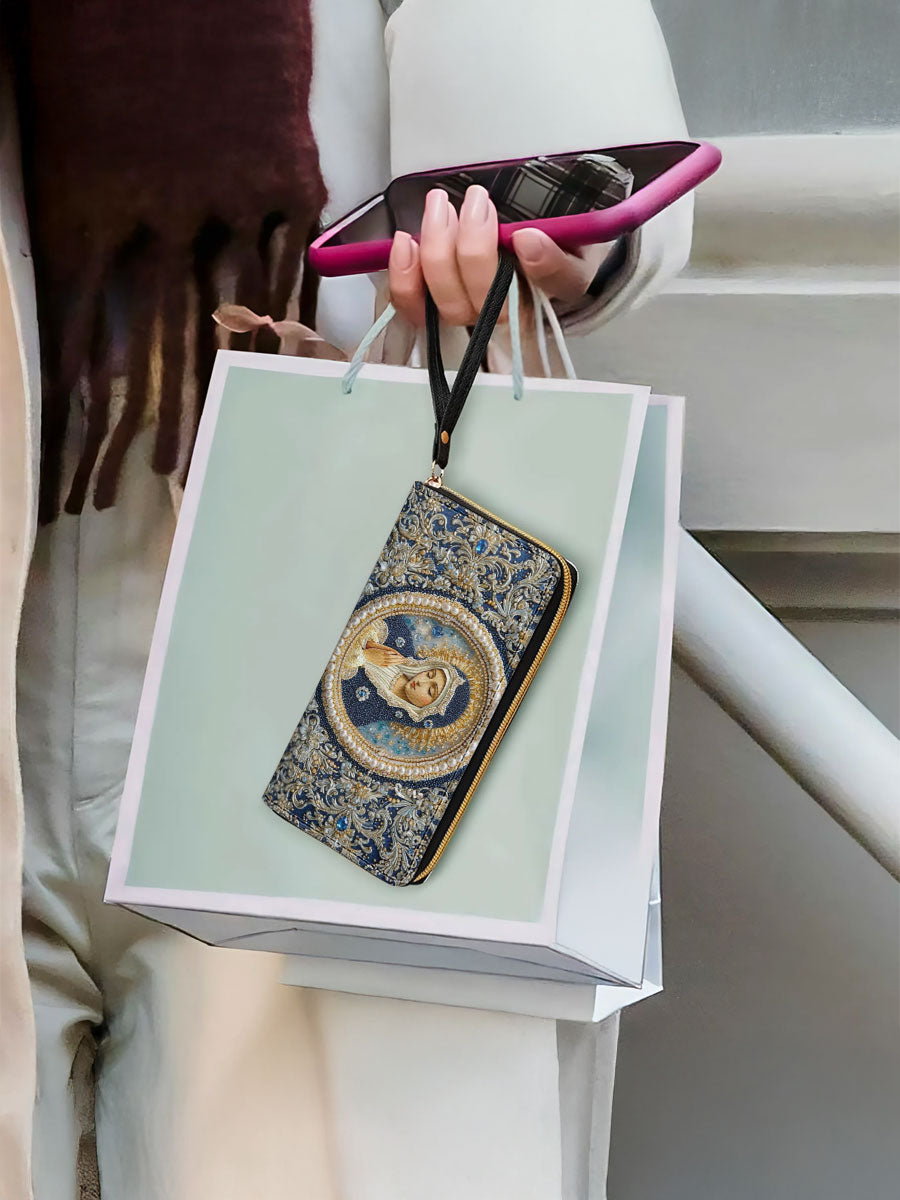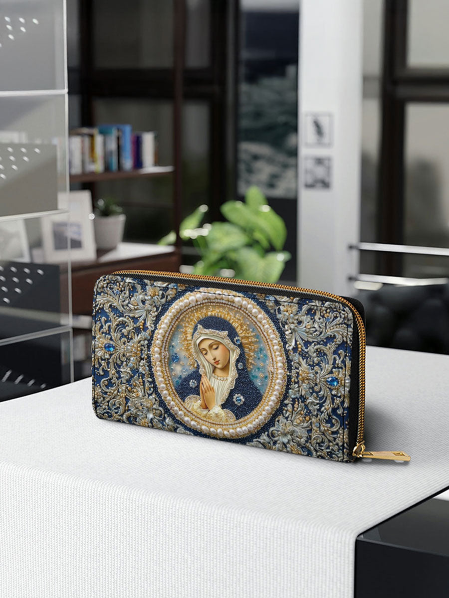 A design inspired by the quiet beauty of prayer and devotion. This wallet captures the gentle spirit of the Virgin Mary, her face lowered in peaceful reverence, radiating compassion and divine serenity. Surrounded by celestial light and Marian blue hues, it embodies a message of hope, faith, and feminine grace.