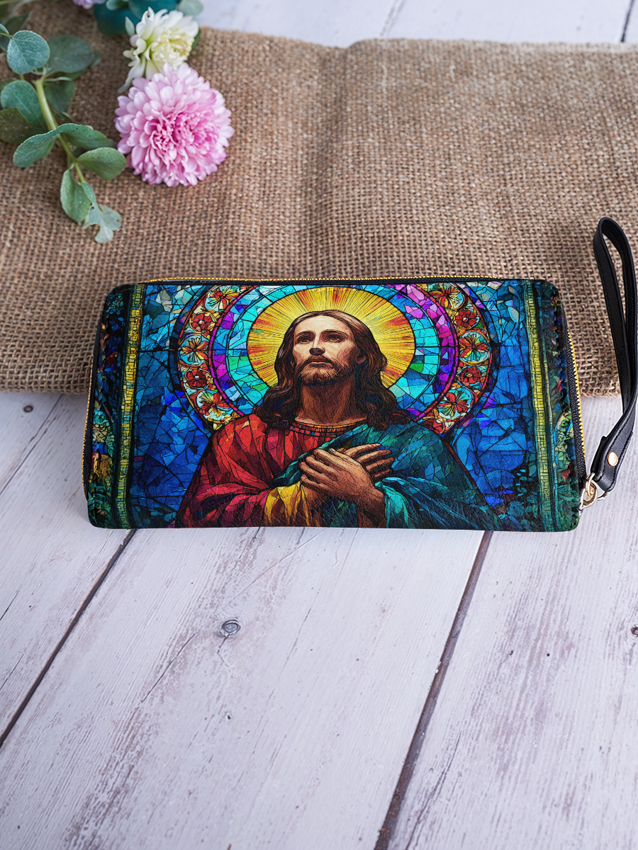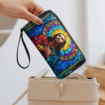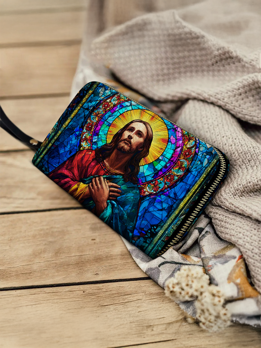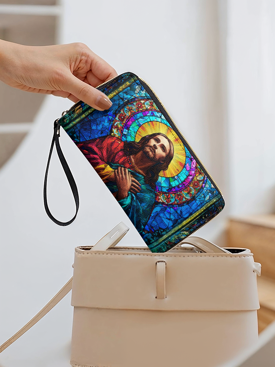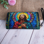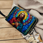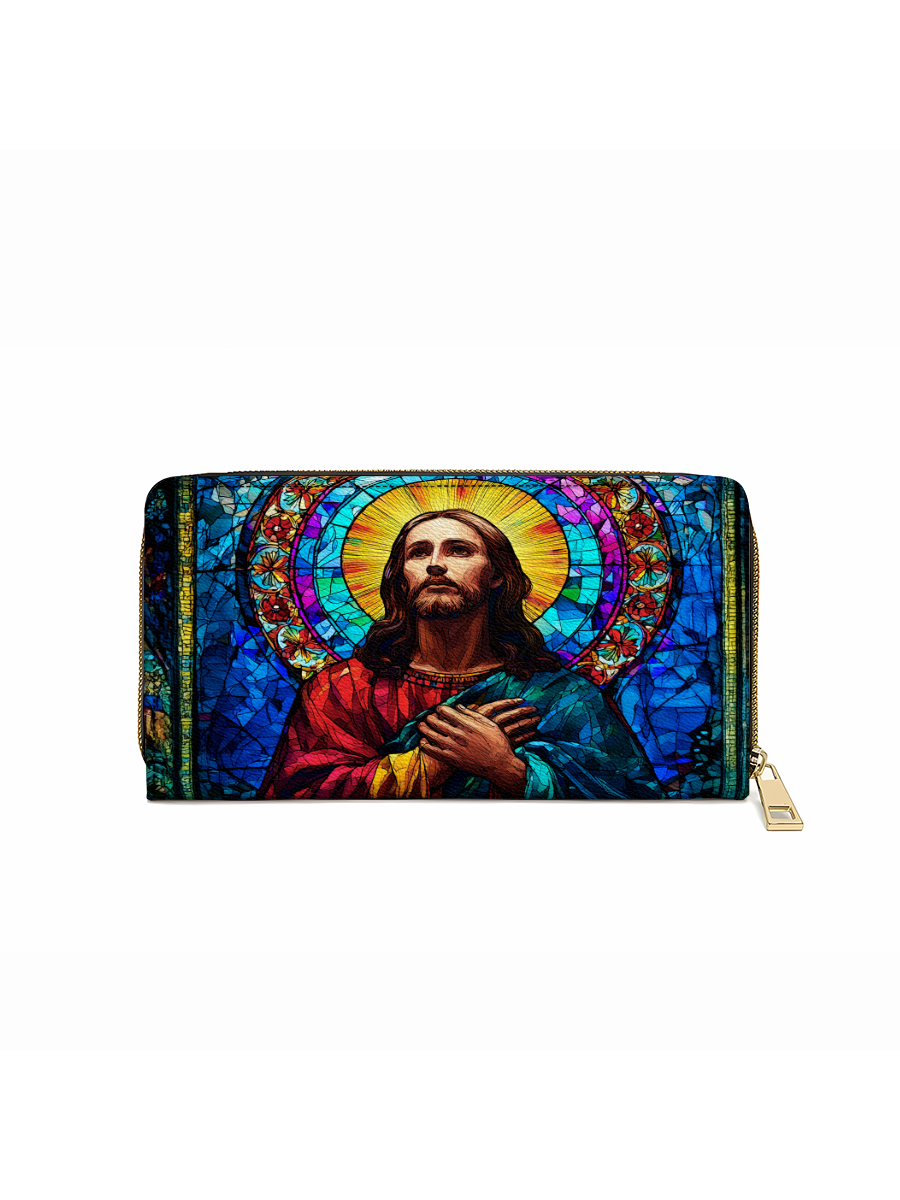 Radiant and uplifting, the Glorious Christ Wallet brings the beauty of stained glass artistry into your everyday life. The design features Christ in majestic colors of red and blue, surrounded by a golden halo and vibrant mosaic details — a timeless reminder of His light and guidance.