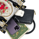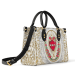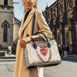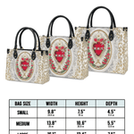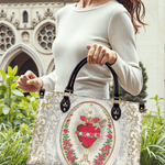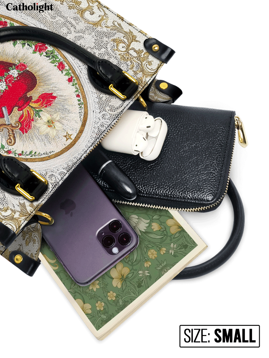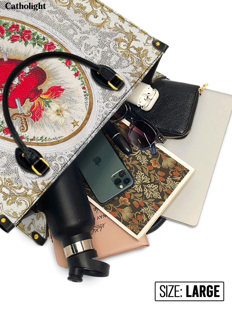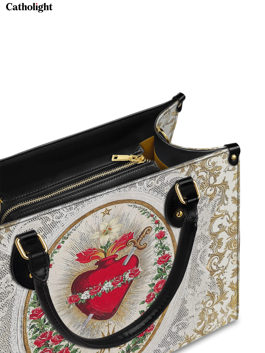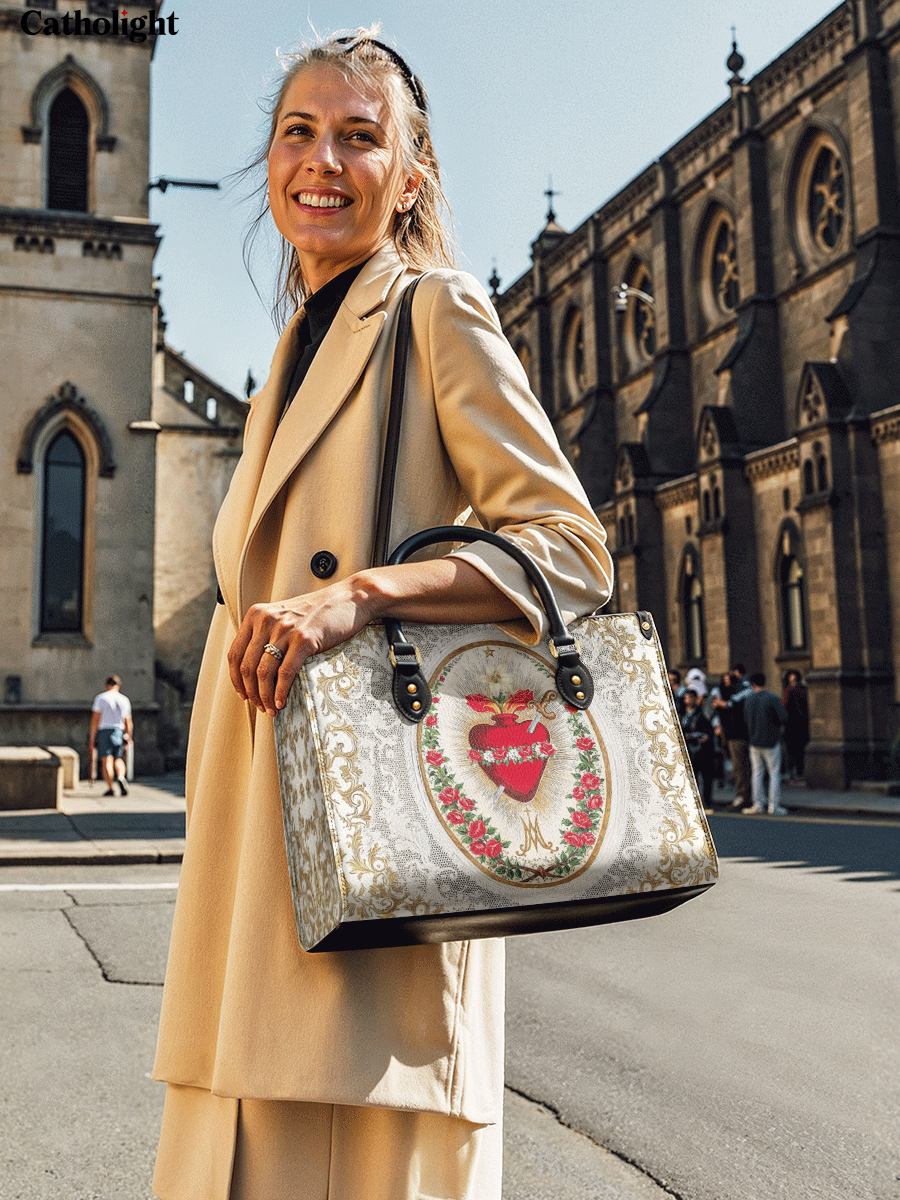 This exquisite leather bag captures the profound beauty and devotion of the Immaculate Heart of Mary. At its center, the radiant heart is surrounded by a delicate wreath of vibrant red roses, symbolizing Mary's pure love, suffering, and compassion for humanity. The heart is adorned with a golden flame and a lily, representing purity and divine grace, while the sword piercing through it echoes Mary's sorrow and sacrifice.