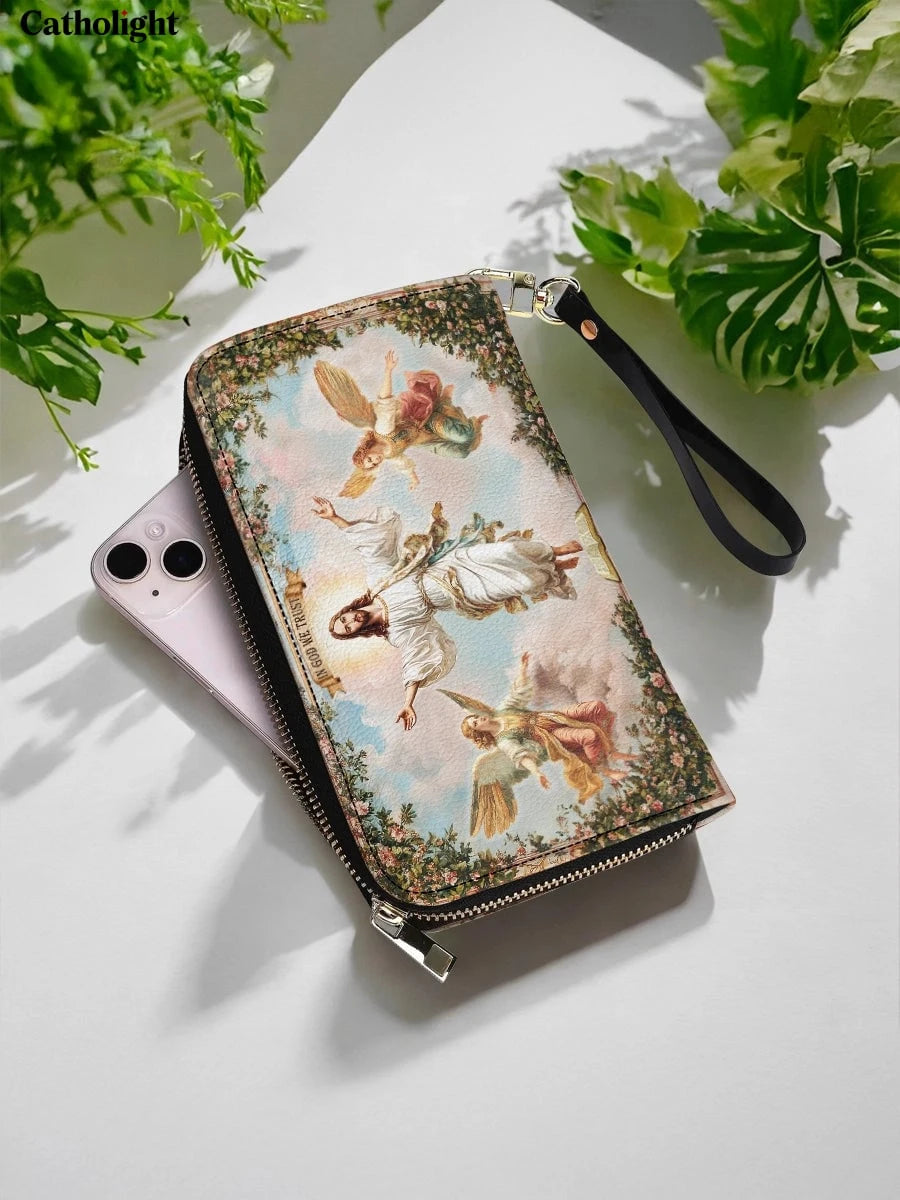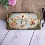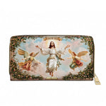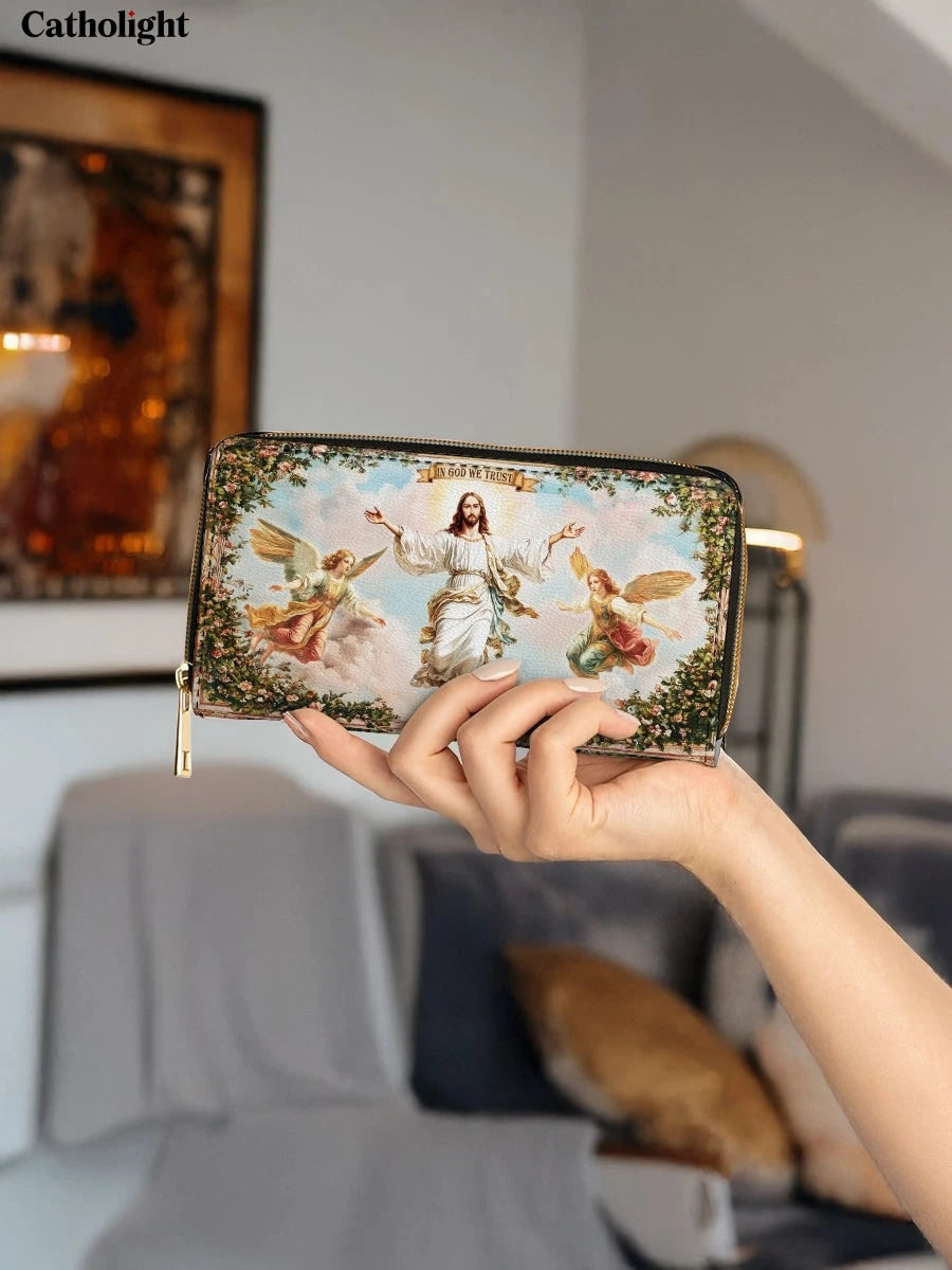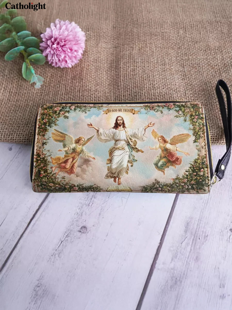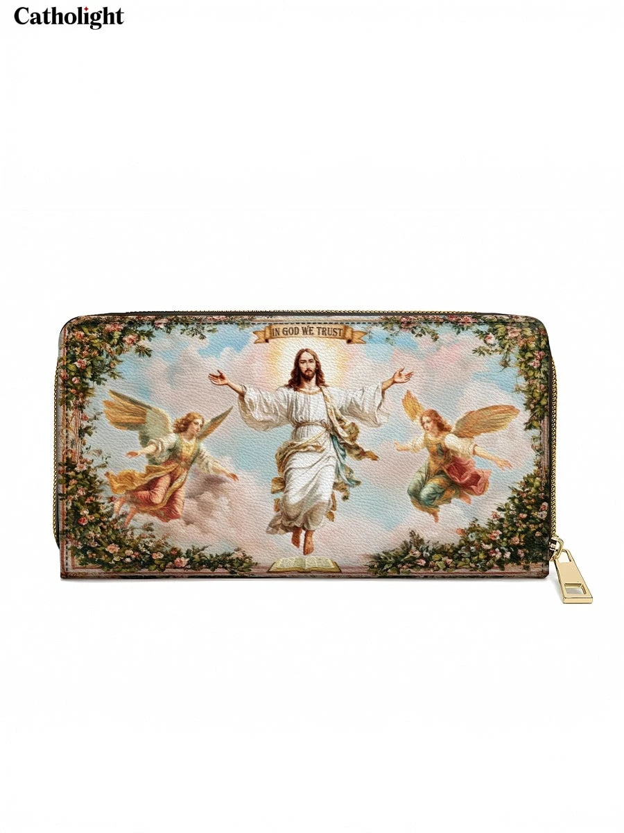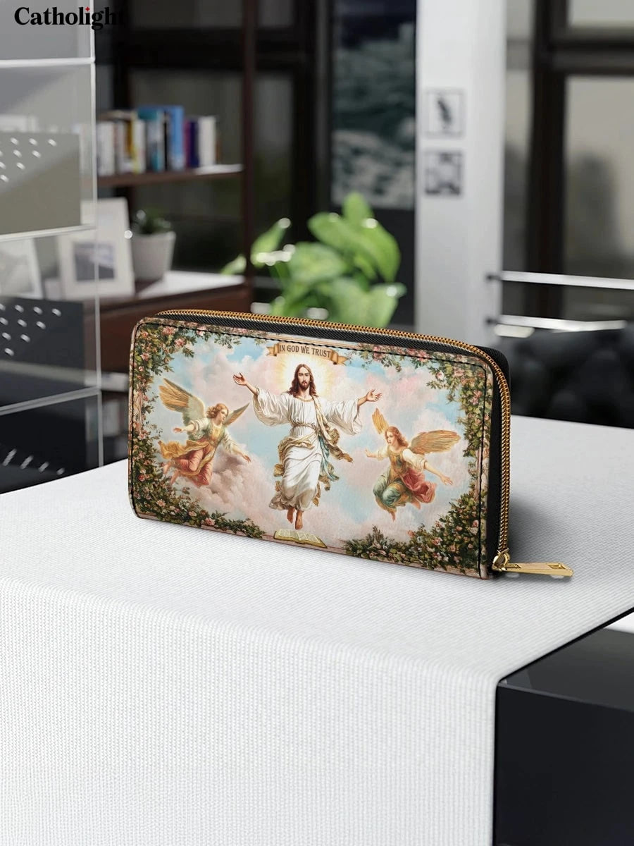 This beautifully designed wallet features a breathtaking illustration of Jesus in a moment of divine glory, ascending amidst a radiant sky. Surrounded by two graceful angels and framed with blooming floral accents, the image exudes peace, hope, and spiritual reassurance. Above, the words "In God We Trust" are elegantly displayed on a golden banner, reinforcing faith and trust in divine providence.