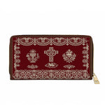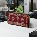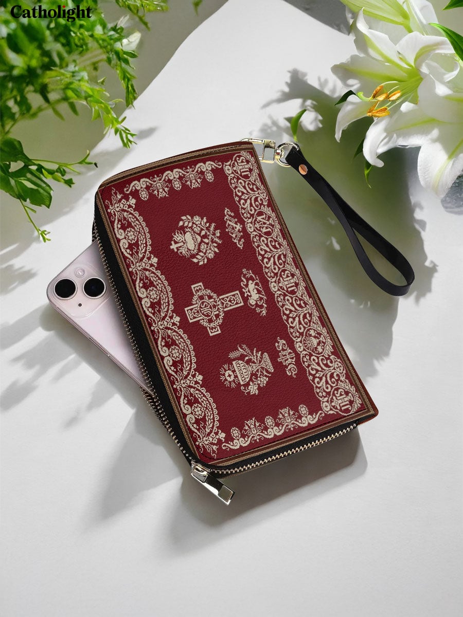 This beautifully crafted wallet showcases a deep crimson background with intricate golden designs featuring a central cross. The cross symbolizes faith and divine grace, surrounded by sacred motifs and floral accents, offering a timeless and meaningful expression of devotion. The rich tones and elegant details inspire reverence and peace.